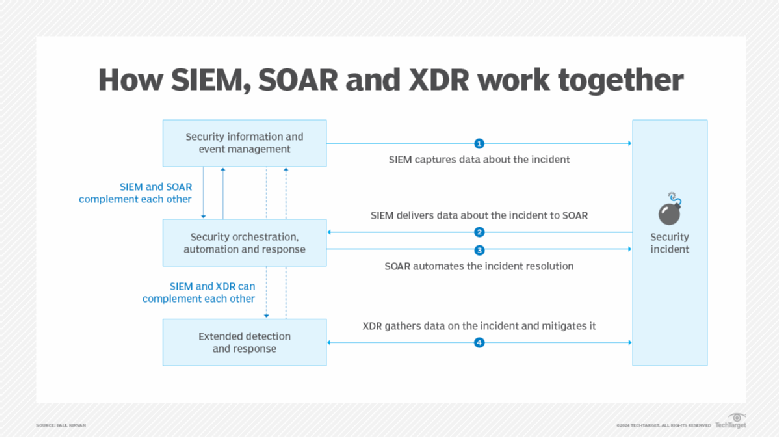 Différentes approches de gestion des informations sur les menaces peuvent impliquer l'utilisation d'outils SIEM, XDR ou SOAR (Security Orchestration, Automation and Response). Un outil SIEM fournira probablement des informations détaillées sur un événement de sécurité, tandis qu'un système SOAR est utile pour collecter des données et déclencher une réponse automatisée à une attaque. Leurs capacités fonctionnent en tandem. Le XDR utilise également les données SIEM, mais ses capacités de réponse sont beaucoup plus étendues que celles du SOAR.