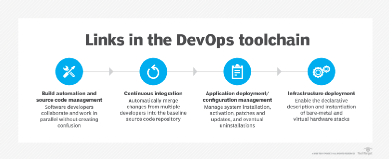 Les développeurs de logiciels peuvent utiliser bon nombre de ces outils pour les tâches de gestion du cycle de vie logiciel (SCM), mais ils ont également recours à d'autres outils, tels qu'Atlassian Bamboo pour la livraison continue et la gestion des versions ; JetBrains TeamCity, Jenkins, Vagrant et Apache Maven pour la gestion de la configuration et l'intégration continue ; Git, Bazaar, Apache Subversion et Mercurial pour la gestion du code source ; des wikis simples pour la documentation ; et JFrog Artifactory, Cloudsmith, MyGet, Yarn, Sonatype Nexus et Apache Archiva pour les référentiels d'artefacts utilisés dans le contrôle de version.