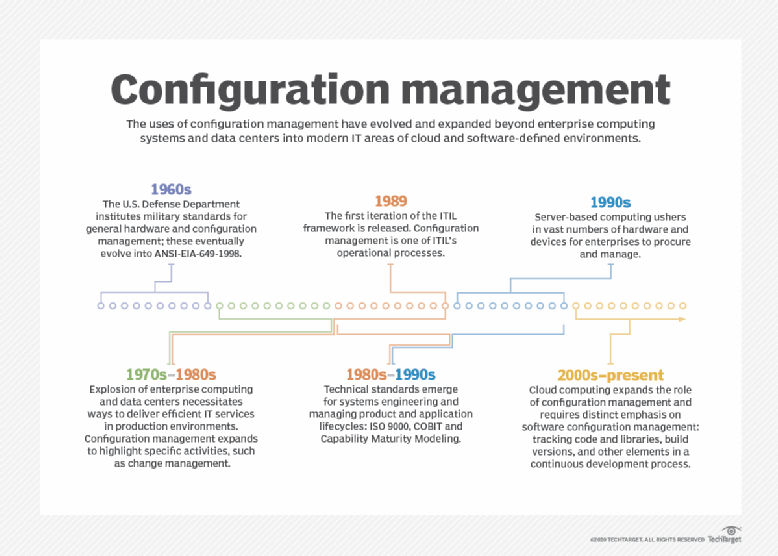 Les responsables informatiques et commerciaux ont rapidement adopté la gestion de configuration avec l'explosion de l'informatique d'entreprise dans les années 1970 et 1980. Les opérateurs de centres de données ont compris que des pratiques standardisées étaient essentielles au bon fonctionnement des serveurs et des systèmes dans un environnement de production. Le service informatique a encore affiné le processus de gestion de configuration afin d'y inclure des activités spécifiques, telles que le contrôle ou la gestion des changements, afin de garantir que les changements soient documentés et validés.