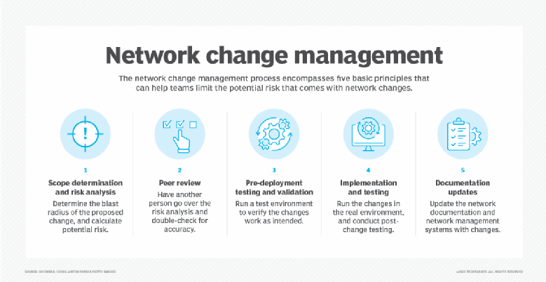Les équipes réseau doivent associer l'évaluation de la portée à l'analyse des risques. Elles doivent ensuite soumettre le changement à des évaluations par les pairs, à des tests et à une validation préalables au déploiement, à une mise en œuvre et à des tests, ainsi qu'à des mises à jour de la documentation.