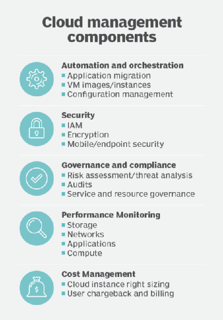 Les produits de gestion cloud les plus complets offrent des fonctionnalités qui couvrent ces cinq catégories :