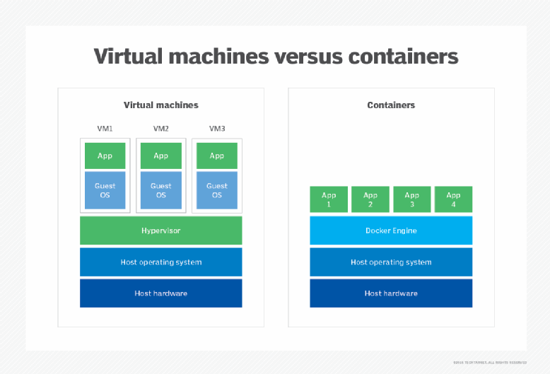 L'efficacité des machines virtuelles hébergées a donné naissance au développement des conteneurs. Le concept de base des conteneurs est identique à celui de la virtualisation hébergée, où un hyperviseur est installé au-dessus d'un système d'exploitation hôte et où toutes les instances virtuelles partagent le même système d'exploitation. Mais la couche hyperviseur (par exemple, Docker et Apache Mesos) est spécialement conçue pour les volumes élevés de petites machines virtuelles efficaces destinées à partager des composants ou des dépendances communs, tels que des binaires et des bibliothèques. Les conteneurs ont connu une croissance significative avec les architectures logicielles basées sur les microservices, où des composants agiles et hautement évolutifs sont déployés et supprimés rapidement de l'environnement.