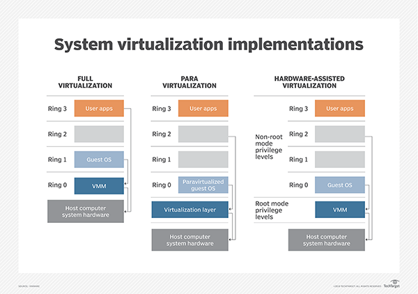 Il existe de nombreuses offres de virtualisation sur le marché actuel, mais le choix des fournisseurs et des produits dépend souvent fortement des objectifs de virtualisation et des infrastructures informatiques en place. Les organisations qui ont besoin d'hyperviseurs bare metal (de type 1) pour leurs charges de travail de production peuvent généralement choisir entre VMware vSphere, Microsoft Hyper-V, Citrix Hypervisor, IBM Red Hat Enterprise Virtualization (RHEV) et Oracle VM Server pour x86. VMware domine le paysage actuel de la virtualisation grâce à ses nombreuses fonctionnalités et à sa polyvalence. Microsoft Hyper-V est un choix courant pour les organisations qui ont déjà standardisé leurs plateformes Microsoft Windows Server. RHEV est couramment utilisé dans les environnements Linux.