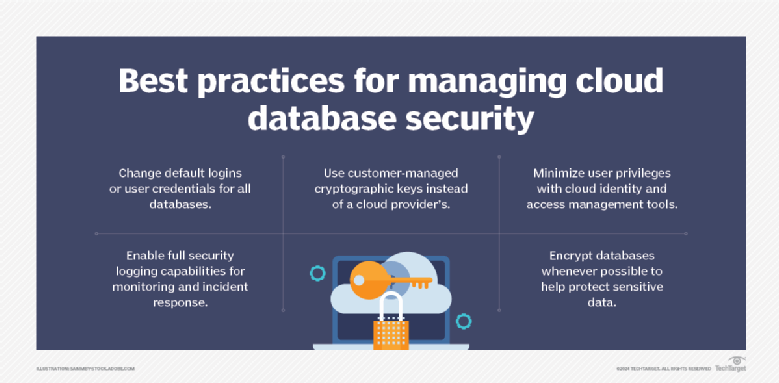 Pour éviter les violations et les expositions de données, les meilleures pratiques en matière de sécurité des bases de données pour les organisations utilisatrices consistent notamment à modifier les identifiants et les informations d'identification par défaut, à utiliser des clés cryptographiques autogérées et à activer toutes les fonctionnalités de journalisation de sécurité.