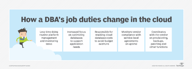 Mais l'utilisation d'une base de données cloud modifie les responsabilités des équipes informatiques et de gestion des données. Les fournisseurs de cloud installent et gèrent l'infrastructure système sous-jacente et, dans les environnements de services gérés, la plate-forme de base de données. Cela réduit le travail de gestion courant traditionnellement effectué par les opérateurs informatiques et les administrateurs de bases de données (DBA). Un DBA peut alors se consacrer à d'autres tâches, telles que l'optimisation des bases de données pour les applications et le suivi de l'utilisation et du coût des systèmes de bases de données cloud.