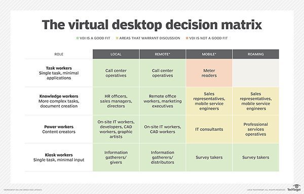 La VDI est une technologie commerciale puissante pour des cas d'utilisation bien adaptés. Pour déterminer si la VDI est adaptée, les organisations doivent évaluer soigneusement leurs utilisateurs en fonction de leurs activités et de leur lieu de travail.