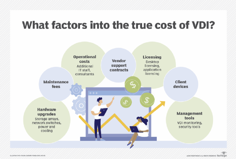 Coûts supplémentaires. Les organisations doivent examiner en détail les aspects financiers liés à la VDI. Si la prolongation de la durée de vie du matériel des terminaux permet de réaliser des économies, les coûts supplémentaires liés à l'infrastructure informatique, au personnel, aux licences et à d'autres éléments peuvent s'avérer plus élevés que prévu.