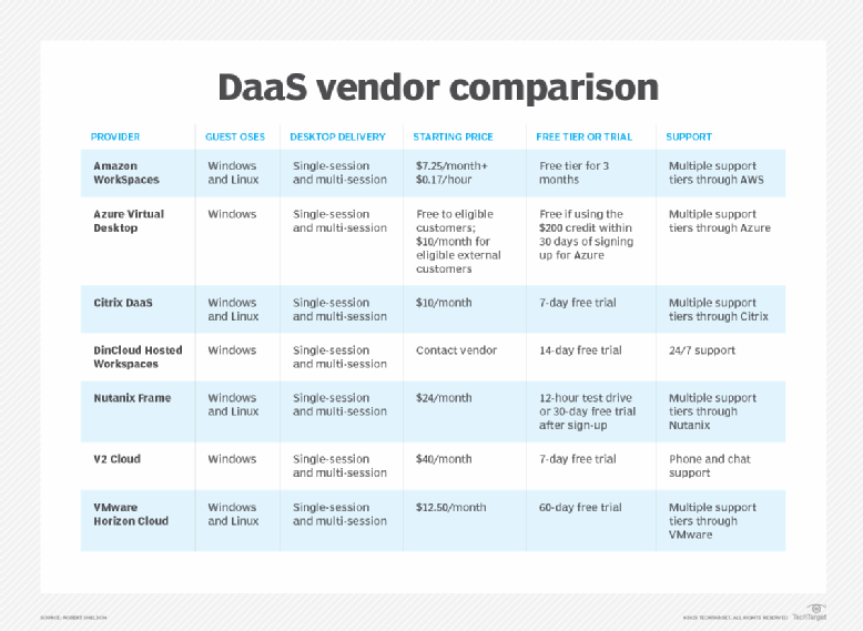 De nombreux fournisseurs de VDI sur site proposent également une offre DaaS. Par exemple, Citrix propose Citrix Managed Desktops, VMware propose Horizon DaaS et Microsoft a lancé Windows Virtual Desktop basé sur Azure en 2019. Amazon propose également une offre DaaS, Amazon WorkSpaces.
